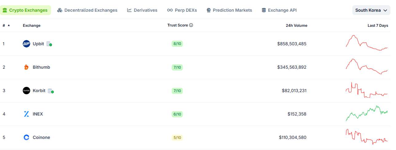 Upbit is the top South Korean crypto exchange by 24-hour trading volume, according to CoinGecko, followed by Bithumb and Korbit.