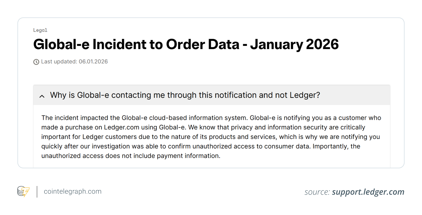 In early January 2026, some Ledger customers were notified that personal and order information related to Ledger.com purchases had been accessed during a security incident involving Global-e, a third-party e-commerce partner that acts as the “merchant of record” for certain orders.