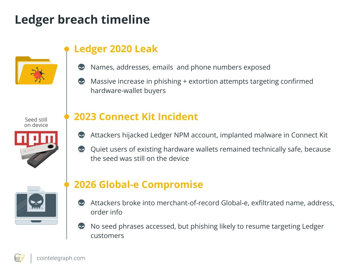 Did you know? The 2026 Global-e compromise was not the only time Ledger buyer data was exposed. After a July 2020 breach of Ledger’s e-commerce and marketing database, a data set later published in December 2020 reportedly included more than 1 million email addresses and roughly 272,000 records containing names, physical addresses and phone numbers.