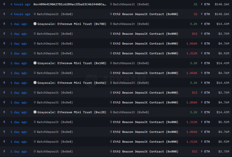 Grayscale has been stacking and staking ETH for its recently launched staking ETH over the past few days, with hundreds of millions worth deposited on the Beacon Chain, according to Arkham Intelligence.