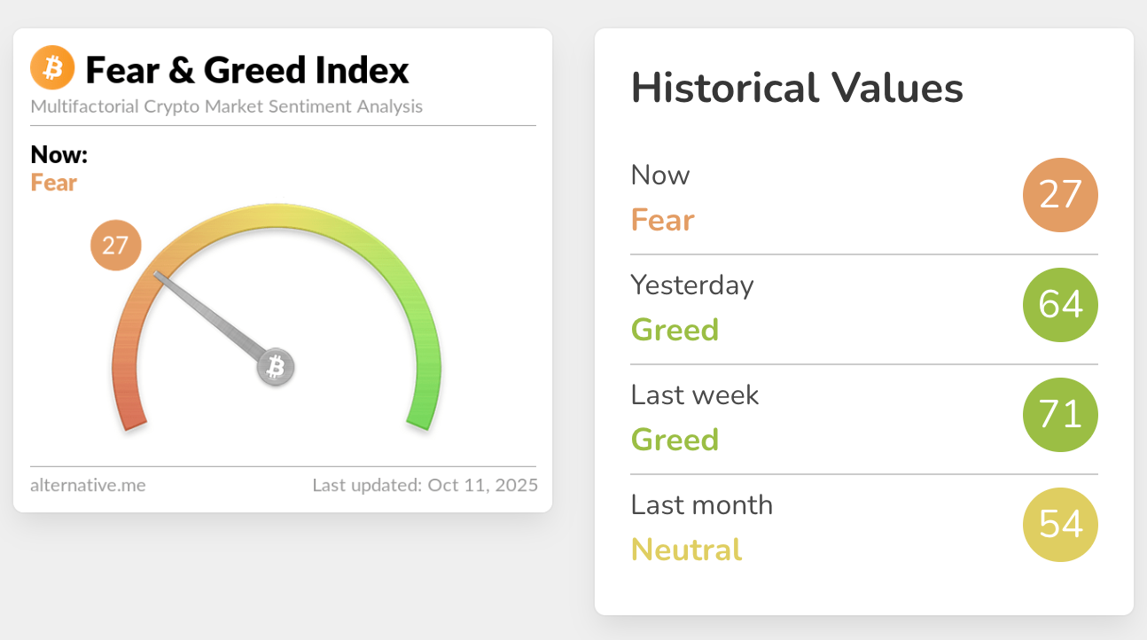 The Crypto Fear & Greed Index, which gauges overall market sentiment, fell to a “Fear” level of 27 in its Saturday’s update, representing a decline of 37 points from Friday’s “Greed” reading of 64.