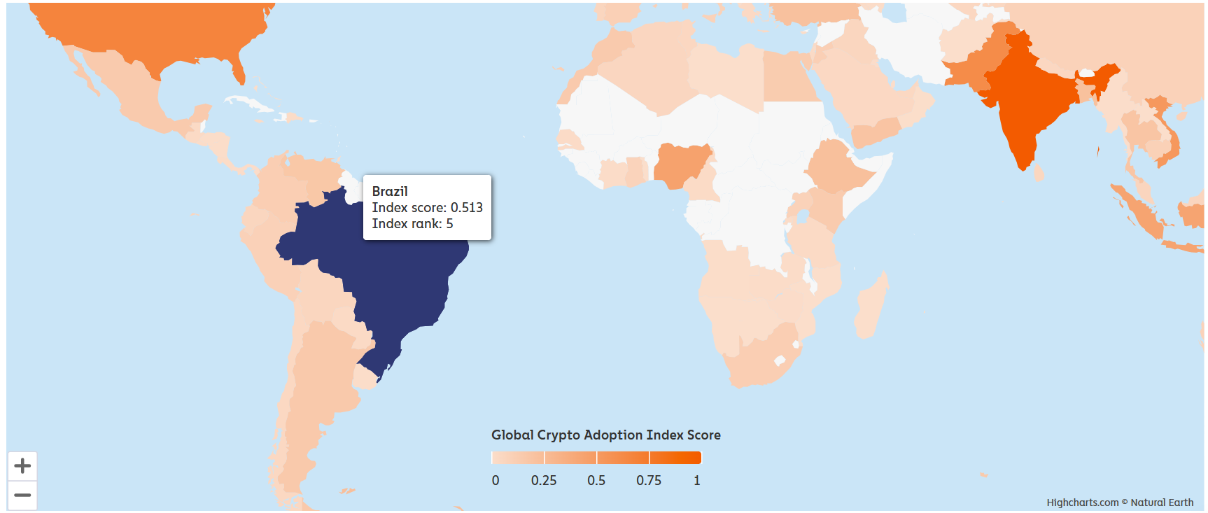 Brazil ranks fifth globally in crypto adoption, thanks in part to stablecoin transactions and access to retail and DeFi services. Source: Chainalysis