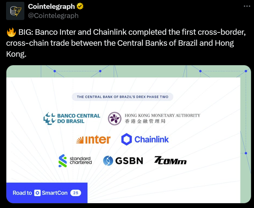 Banco Inter has previously worked with Chainlink, including in an earlier Phase 2 pilot of Brazil’s Drex digital currency project.