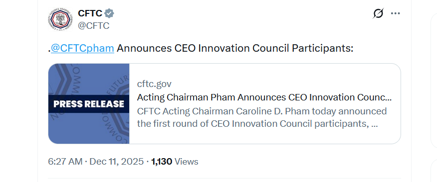 “We are building on the success of the CFTC Crypto CEO Forum and the SEC-CFTC Joint Roundtable with our CFTC CEO Innovation Council, specifically focused on market structure developments in derivatives markets,” said acting CFTC Chairman Caroline Pham.