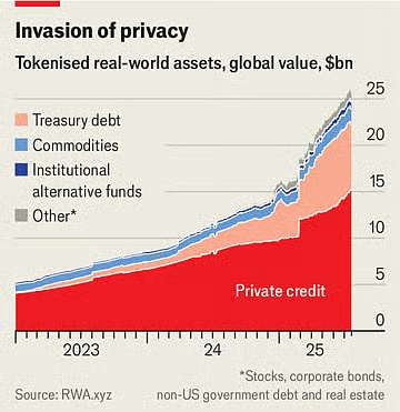 然而,最新一波热潮却有所不同。7 月 18 日,唐纳德·特朗普总统签署《稳定币法案》 (GENIUS Act),为稳定币(以传统资产(通常是美元)为支撑的加密代币)提供了业内人士长期渴望的监管确定性。该行业正处在蓬勃发展期;华尔街人士如今正争相参与其中。「代币化」也正在兴起:链上资产交易量迅速增长,包括股票、货币市场基金,甚至私募股权和债务。
