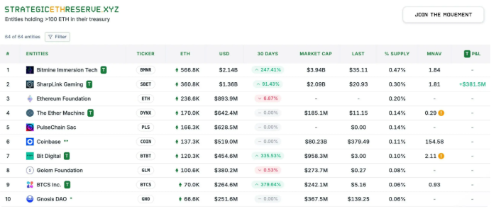 与此同时,BitMine 也启动了疯狂的“买买买”模式,仅仅一个月内,该公司的 ETH 持仓便已攀升至 566,776 枚,超越了以太坊基金会以及另一家起步更早的 ETH 财库公司 Sharplink Gaming。