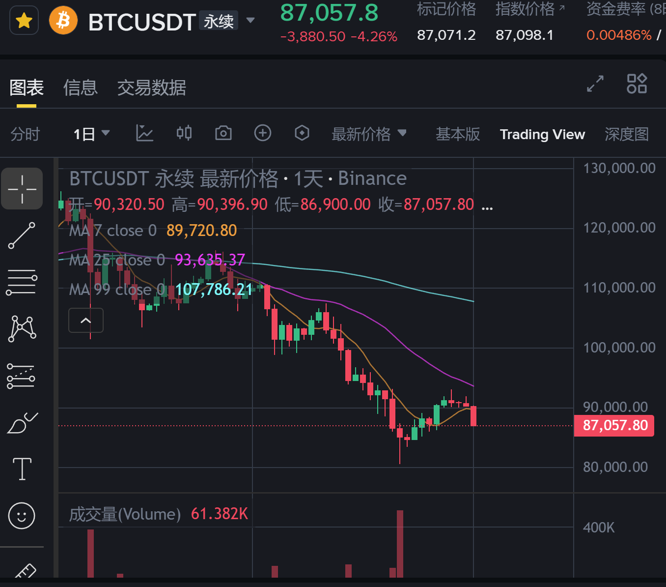 面对持续的市场抛售,投资者最关心的问题是:市场底部在哪里?80000美元关口成为下一个关键支撑位。